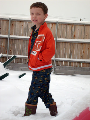 When we let Brody the Beagle out for his first snow he went crazy. He loved it so much and buried his head deep in the snow and then came up to eat it. Luke started to run outside to play with Brody and I quickly stopped him. I informed him that he was not going to go out and play in pajamas while barefoot. He ran to his room and quickly returned looking like this.