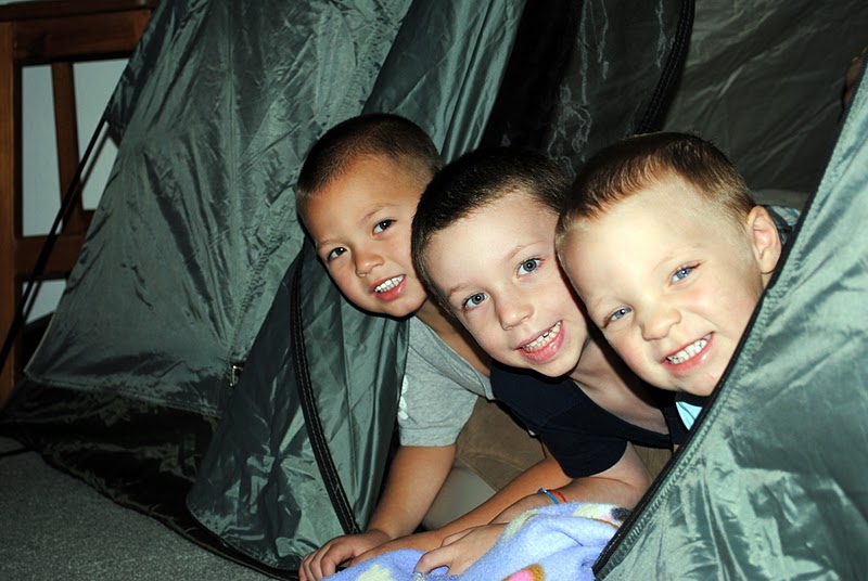 So, we improvised. Joshua pitched the tent in the living room, blew up a big air mattress, and the boys were set! Camping in the cool and air conditioned house.